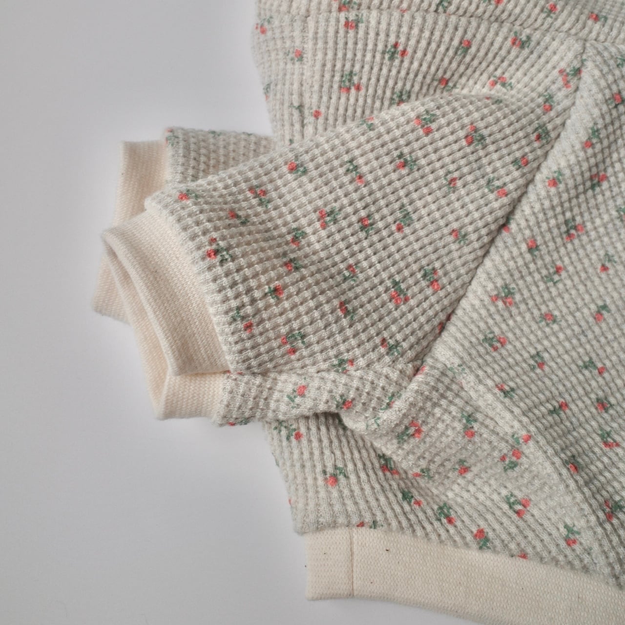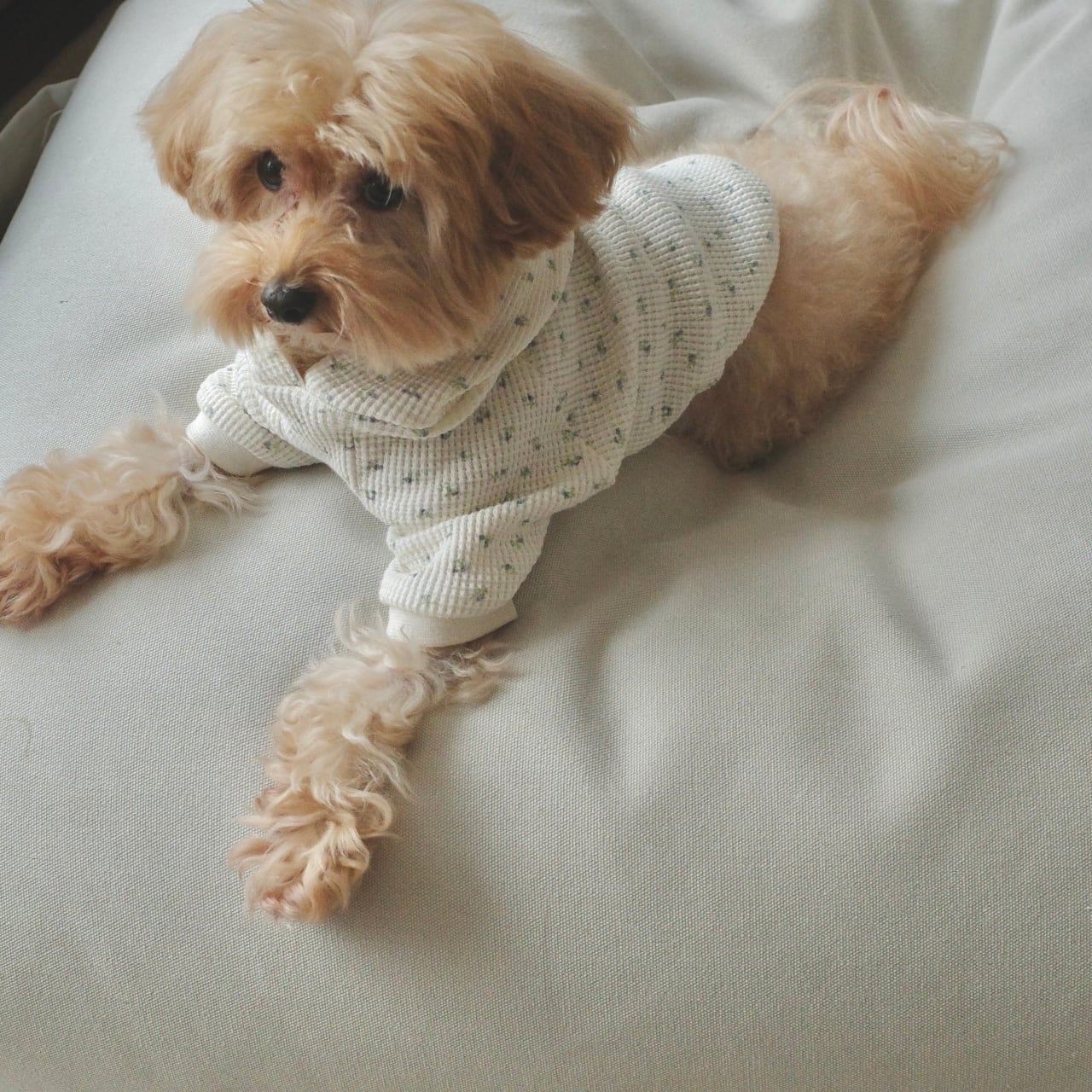 コットン100%生地で作った可愛らしいお花柄のワッフル生地フーディー。柔らかく動きやすいワンちゃんの普段にならないお洋服です。